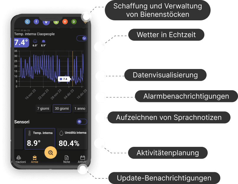 Sie können Ihren Hive-Tech direkt über die 3Bee APP überwachen und werden täglich über den Gesundheitszustand Ihrer Bienenstöcke informiert. Wetter, Gewicht, Luftfeuchtigkeit und mehr jederzeit auf Ihrem Smartphone. Darüber hinaus bieten wir Ihnen dank des Chats Unterstützung an.